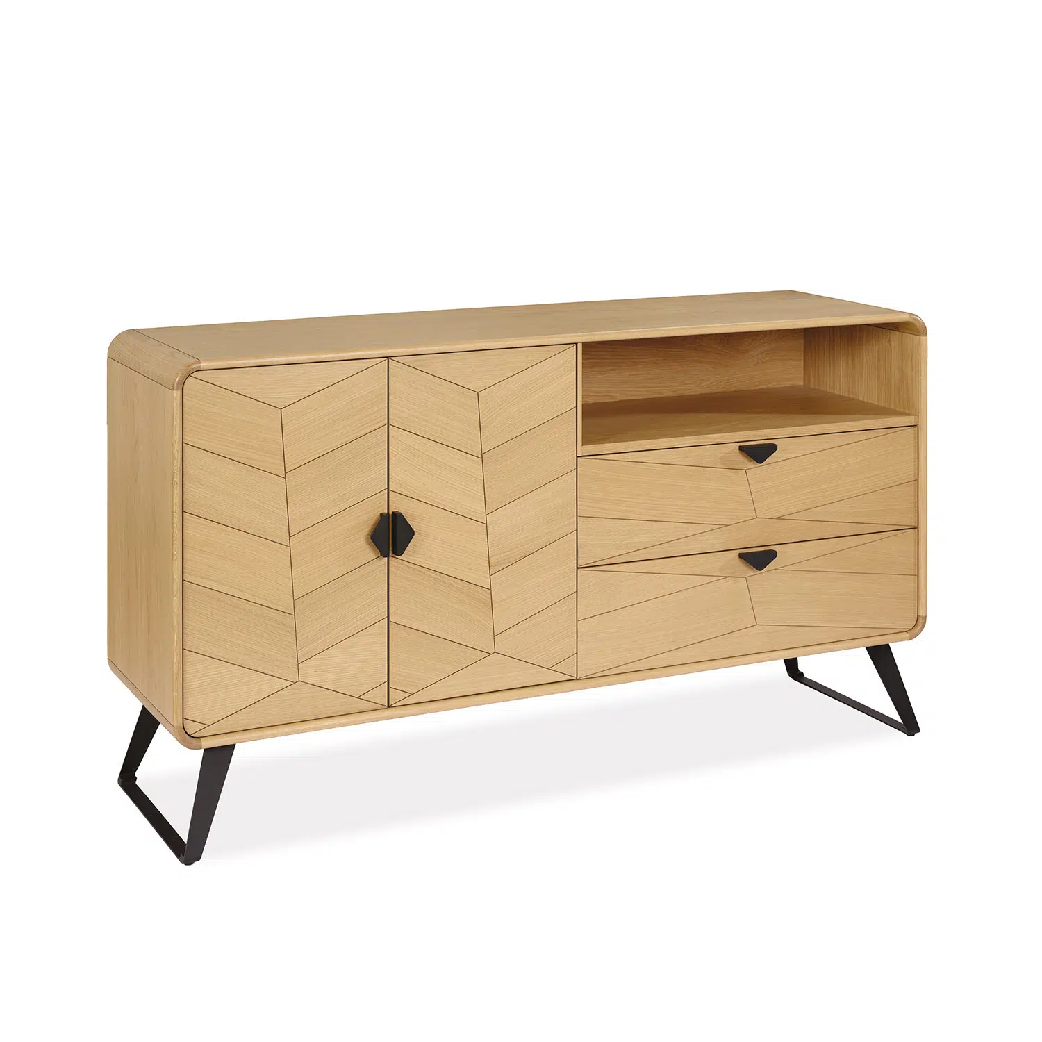 L’enfilade ERYN séduit par ses lignes contemporaines et son élégance naturelle. Avec ses portes au décor chevron, ses angles arrondis en chêne massif et son piètement en fer finition époxy, elle apporte du caractère à votre intérieur tout en offrant un rangement pratique au quotidien.